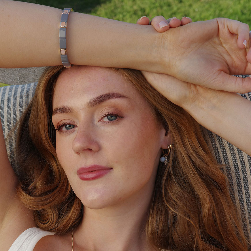 A&C Oslo värviliste lülidega käevõru. Värviline email, kullatud detailid, elastikpael. Ei sisalda niklit, kaadmiumi ega pliid. Valmistatud käsitööna. Ümbermõõt 18cm.