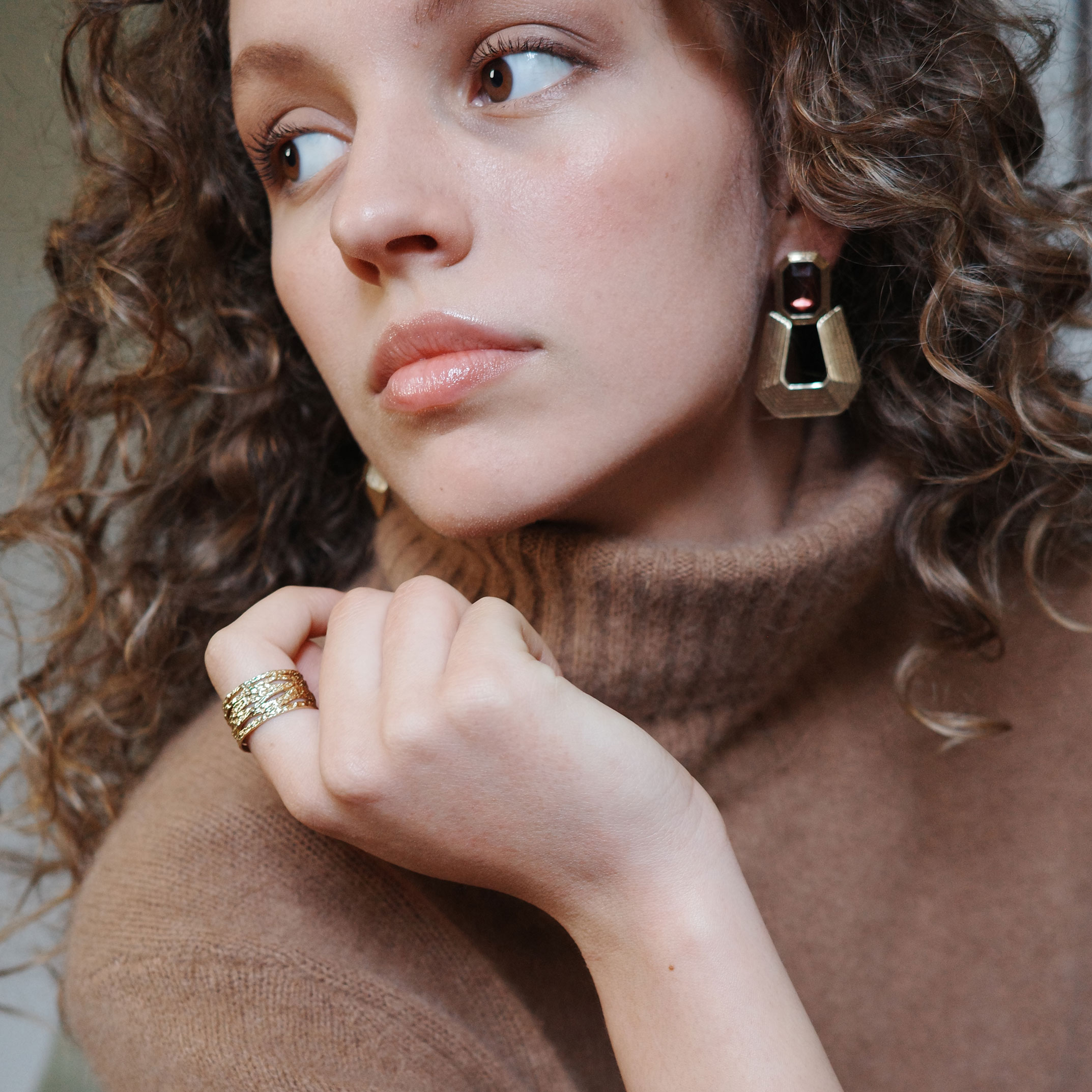 A&C Oslo modernsed kõrvarõngad. Kullatud detailid, käsitsi lõigatud klaas, post- kinnitus on titaanist. Ei sisalda niklit, kaadmiumi ega pliid. Valmistatud käsitööna. Kõrvarõngaste pikkus on 4,4cm.