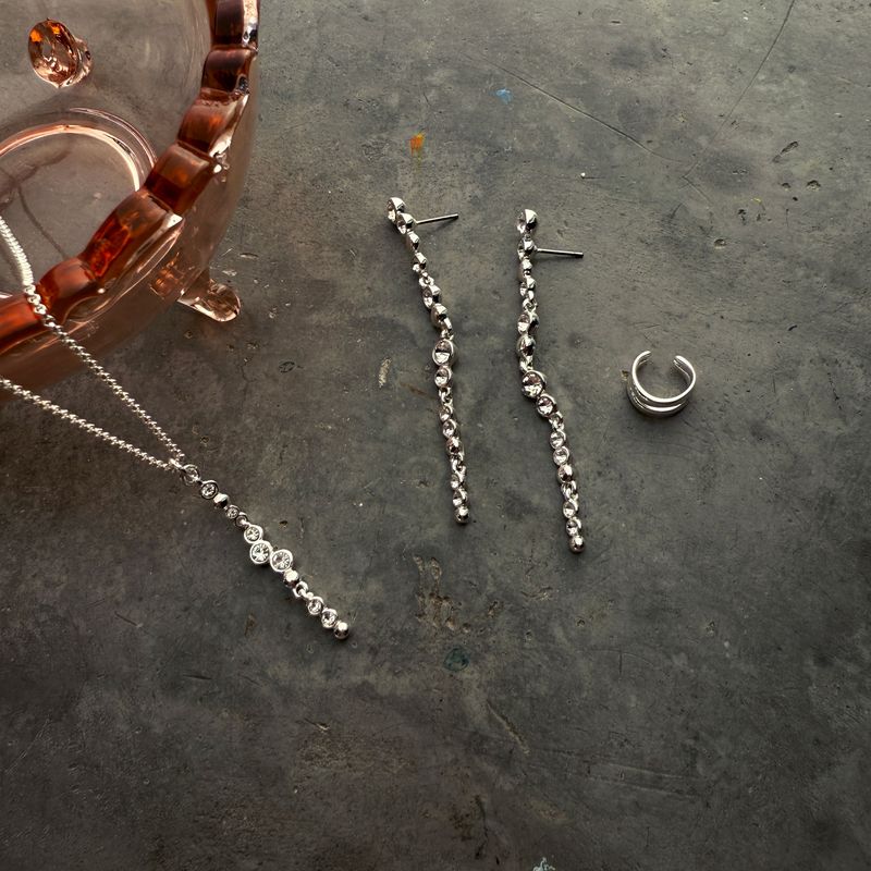 A&C Oslo naiselikud, säravate kristallidega kõrvarõngad. Hõbetatud detailid, post- kinnitus on titaanist. Ei sisalda niklit, kaadmiumi ega pliid. Valmistatud käsitööna. Kõrvarõngaste pikkus on 6,5cm.