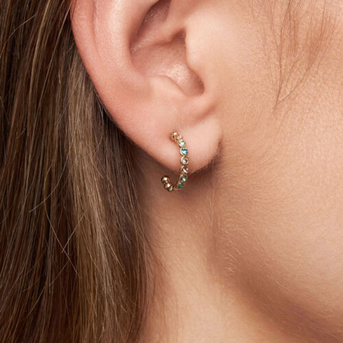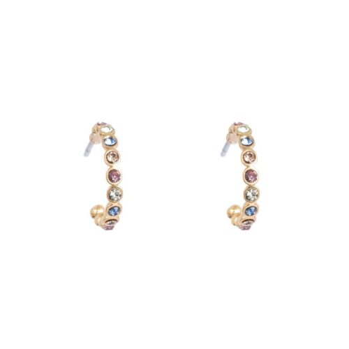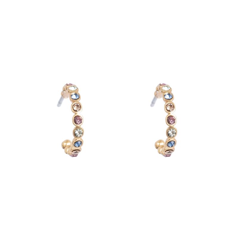 A&C Oslo väikesed, erinevat värvi lihvitud kristallidega kõrvarõngad. Kullatud detailid, post- kinnitus on titaanist. Ei sisalda niklit, kaadmiumi ega pliid. Valmistatud käsitööna. Kõrvarõngaste läbimõõt on 1,5cm.